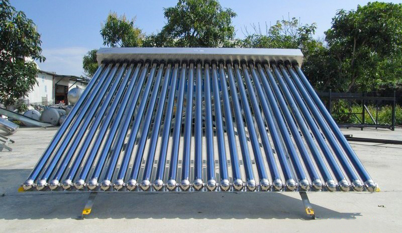 陽光下持續自我運轉免費釋熱的–熱管真空管太陽能集熱器,以真空玻璃內管上的藍色濺鍍塗層透過真空斷熱層吸收太陽輻射熱能,熱傳於管內鋁鰭片再將熱能熱傳給熱管;熱管內部主要以工作液體的汽、液相變傳熱,熱阻很小,因此具有很高的導熱能力並熱交換加熱於匯流管內水液。
